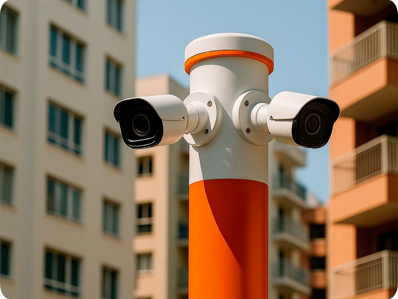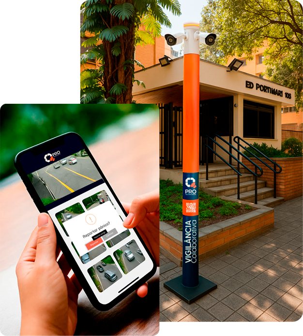 Rede de vigilância colaborativa com totens de câmeras inteligentes, visão de 180º e 360º. Permite monitoramento em tempo real, gravações 24h e armazenamento na nuvem para moradores, vizinhos, síndicos e administradores.